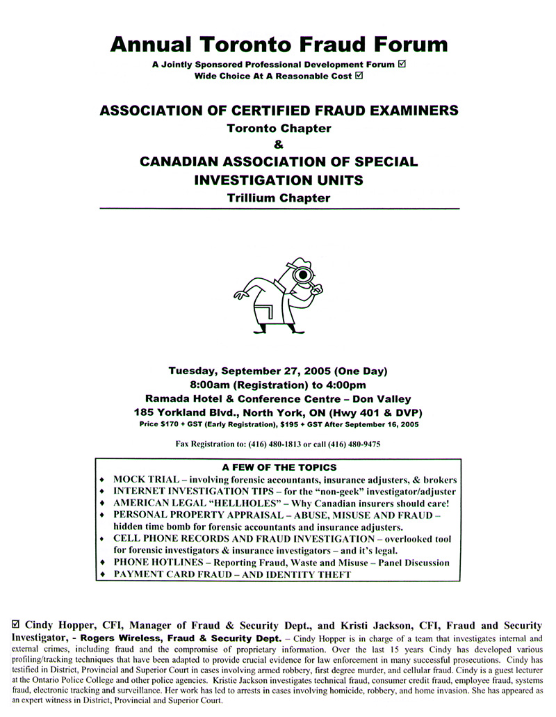 Through his research, Harry found out that Rogers' Manager of Fraud and Security was going to be speaking to a specialized audience of fraud investigators at the Toronto Fraud Forum about the very topic in which my account was embroiled: cell phone theft and cell phone fraud.